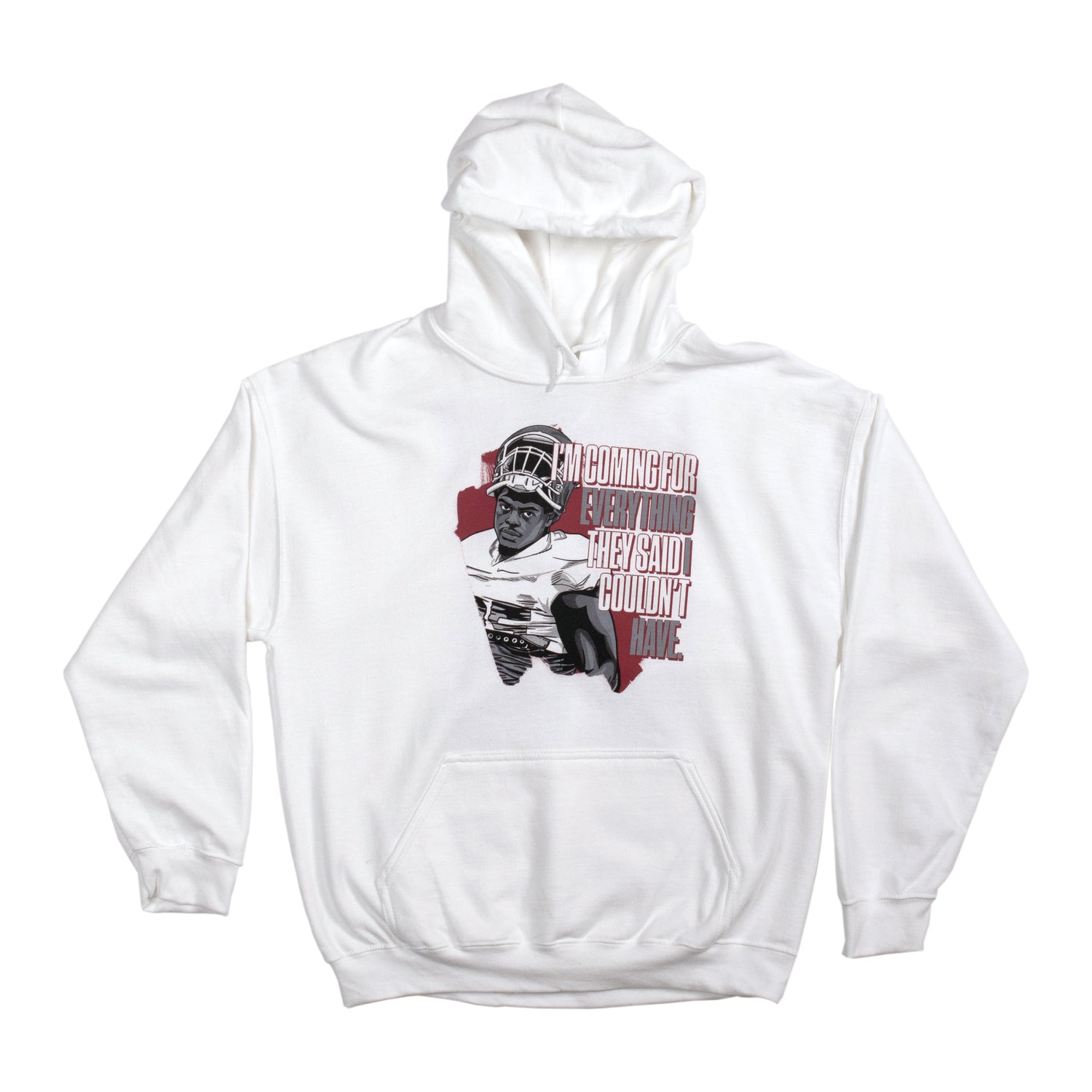 An entire season in the making. We worked on this collection throughout the season and things got a little hectic toward the end because of a certain coach. But we now proudly present the Isaiah Thomas NIL collection and the IT Hoodie in white and red with the slogan that drove him throughout the season and into his upcoming NFL career.