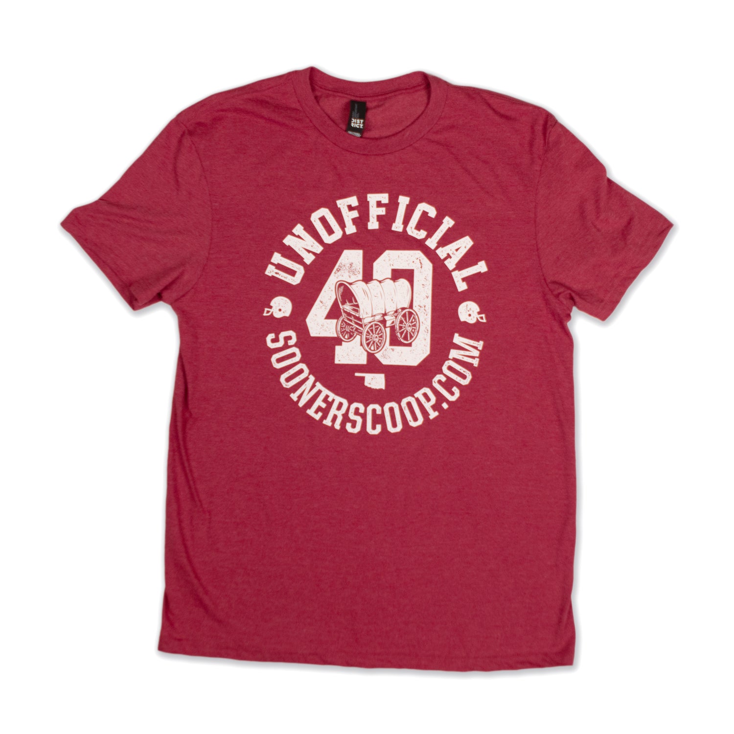 This is our first merch offering with our actual name on it. A circular vintage design featuring the Unofficial 40 podcast as well as our website's name. This one has a little bit of everything and is availabe in the same buttery soft shirts as our retro helmet design. Again, the perfect shade of crimson for Sooner fans and a white shirt instead of grey in this collection. This one just gets better the longer you stare at it. In stock and ready to ship!